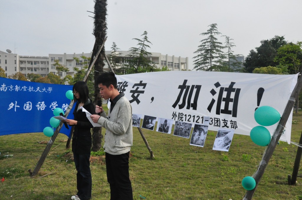 整个活动庄重严肃,引起了现场学生的感触与思考。在悲伤的音乐中,主持人以一段感人的文字开场,接着由三位学生代表轮流讲述了他们所关注的此次地震中的感人事迹,并分享了自己对生命的理解与感悟,不少学生在这个环节中因感动而落泪。在募捐环节里,大家纷纷走上前去,献出了自己的爱心和力量,并且在横幅上写下了对雅安人民的深深祝福。活动在合唱《明天会更好》的歌声中结束,大家希望以歌声为雅安人民加油,共同期待明天会更好。