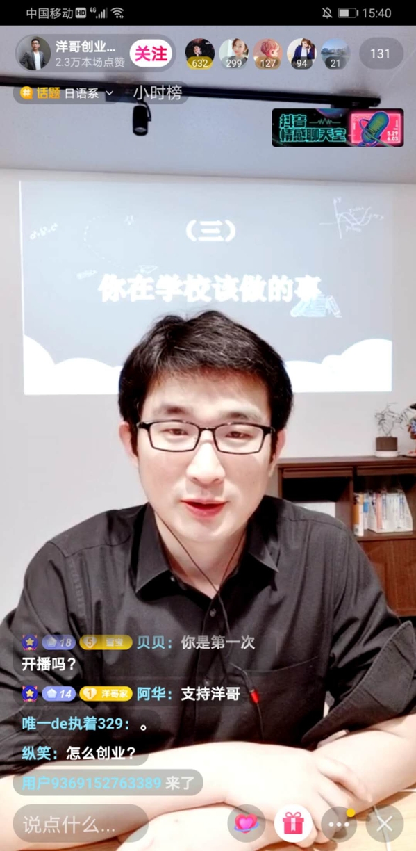5月31日下午,日语系精品企业课程《科技文化创新创想》第三讲通过抖音平台开启,主讲人为日语系03级刘洋学长,现为谷町君CEO,同时也是南航美高梅4688集团am繁星・谷町君奖学金资助者。