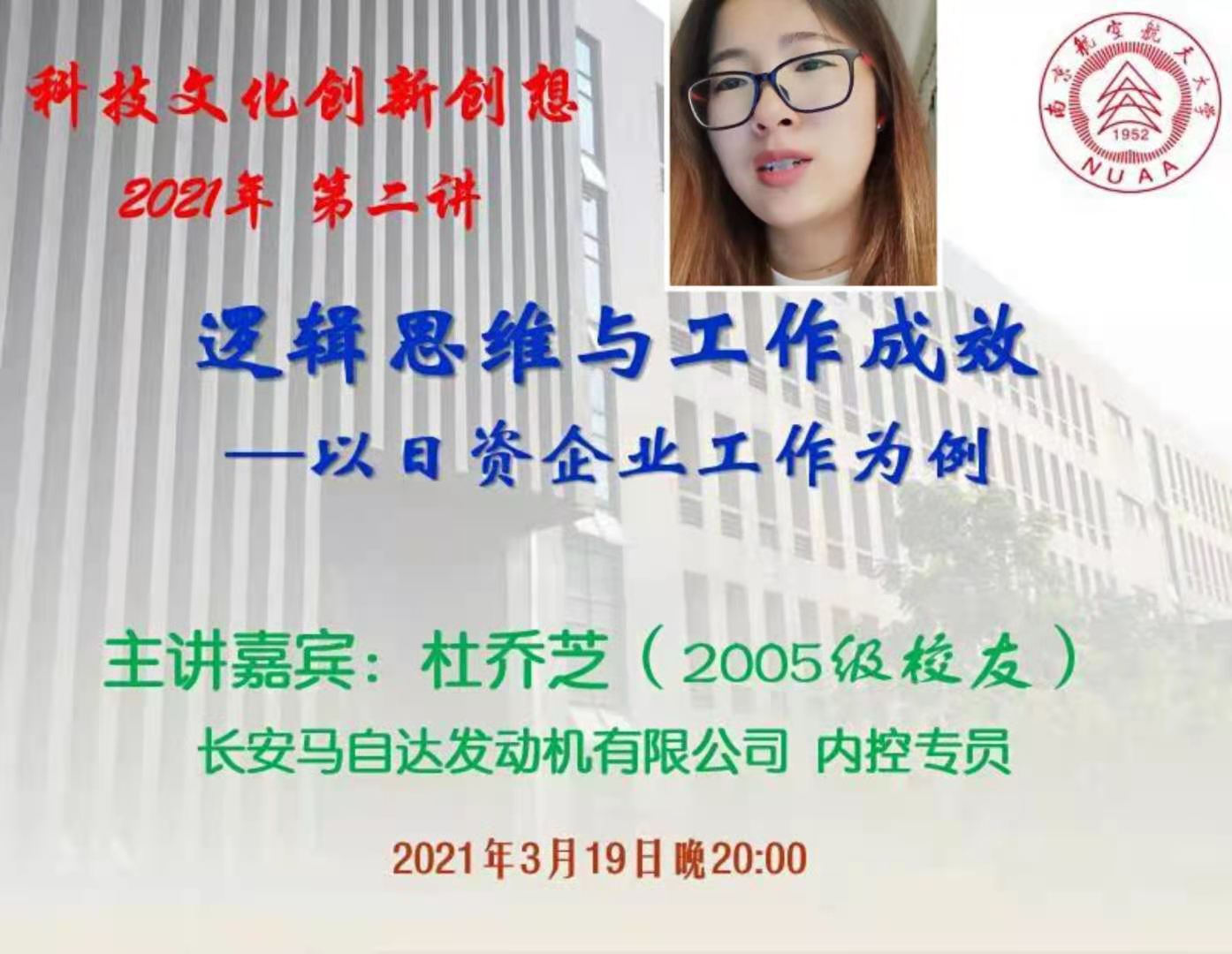 3月19日,美高梅4688集团am日语系科技文化创新创想课程第二讲通过腾讯会议模式开启,主题为《逻辑思维与工作成效—以日资企业工作为例》,主讲人为南航2005级校友杜芝乔,曾任南京长安马自达发动机有限公司总裁助理,现任该公司内控专员。