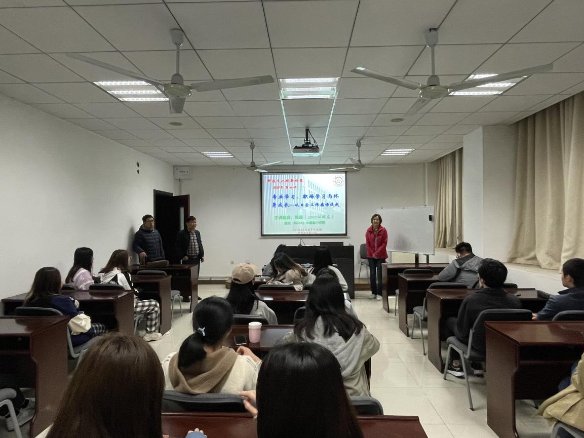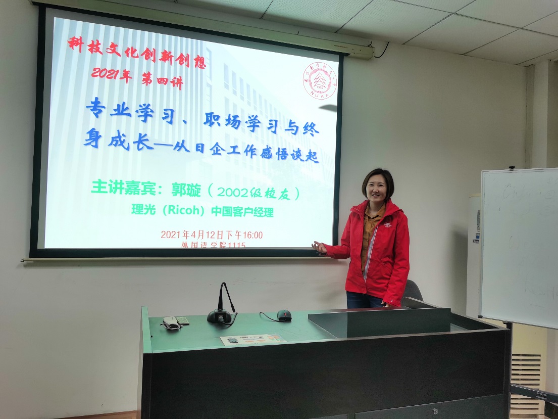 4月12日下午4:00,美高梅4688集团am日语系科技文化创新创新课程第四讲在美高梅4688集团am1115教室成功举办,主题为《专业学习、职场学习与终身成长——从日企工作感悟谈起》。主讲嘉宾为02级日语系校友郭璇,现任理光(Ricoh)中国客户经理。