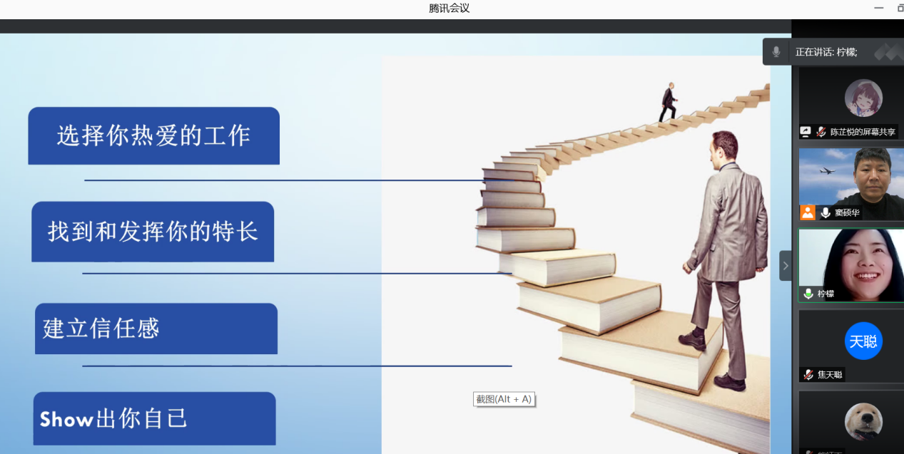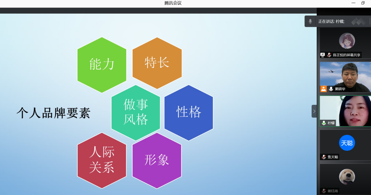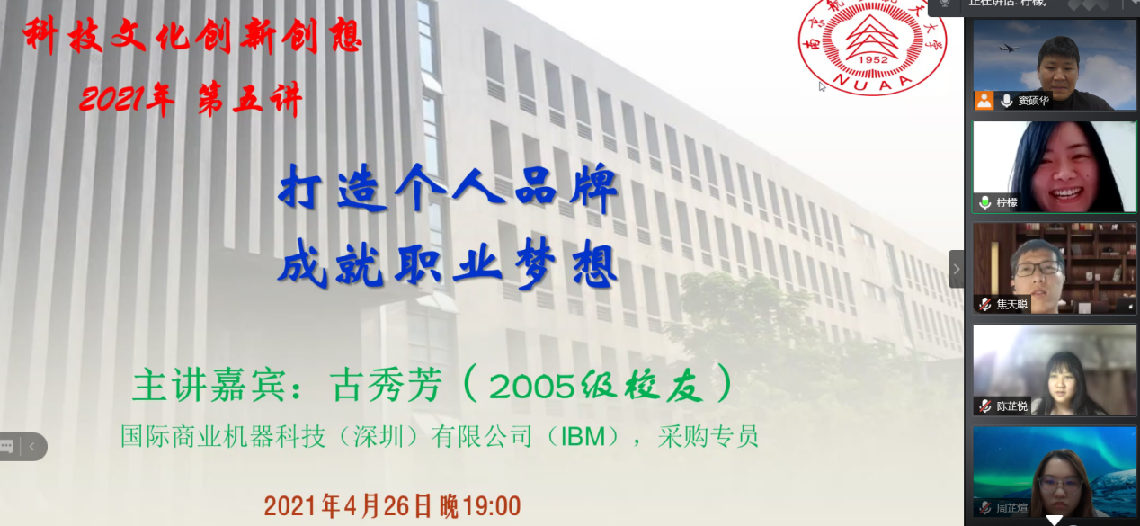 4月26日晚上7:00,美高梅4688集团am日语系科技文化创新创想课程第五讲通过腾讯会议模式开启,主题为《打造个人品牌,成就职业梦想》,主讲人为05级日语系校友古秀芳,现任国际商业机器科技(深圳)有限公司(IBM)采购专员。