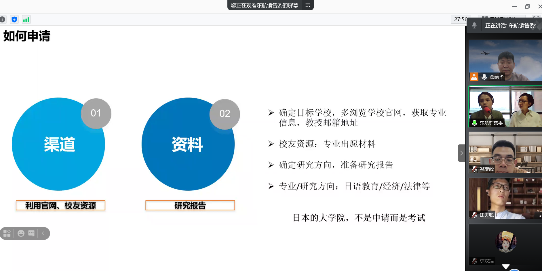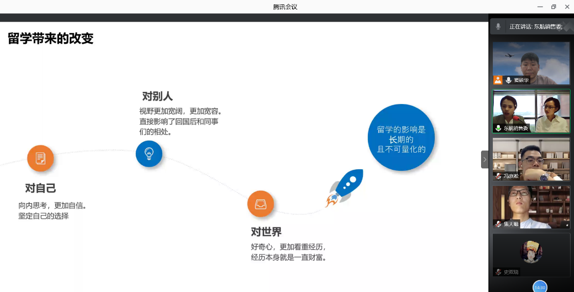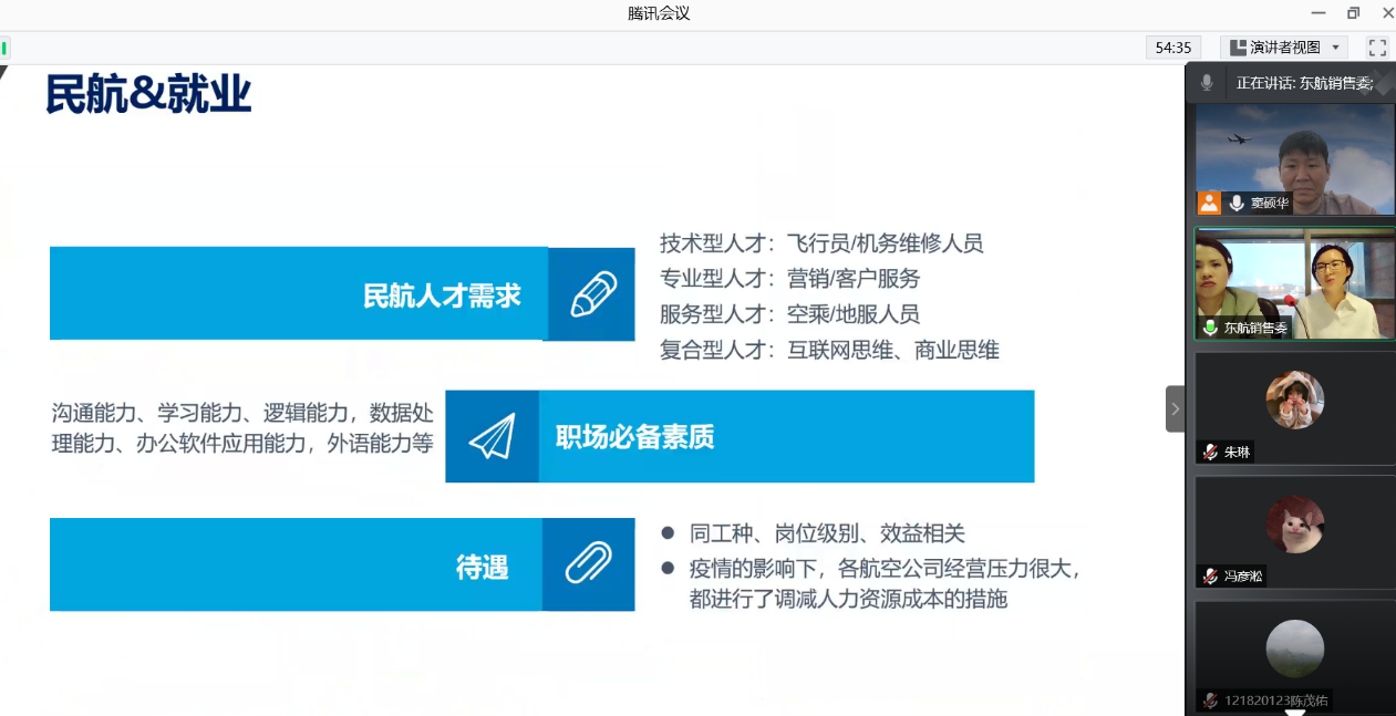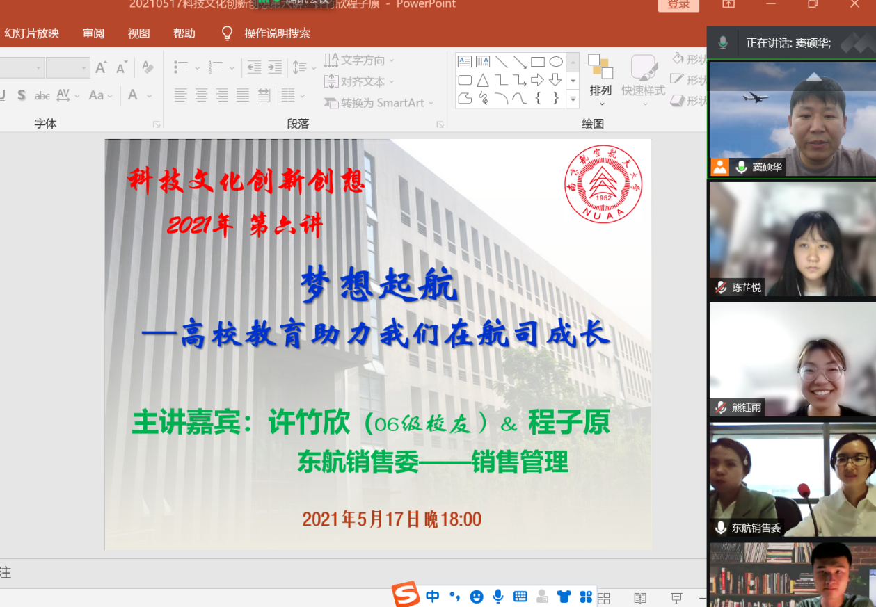 5月17日晚18点,美高梅4688集团am日语系《科技文化创新创想》第六讲通过腾讯会议开启,主题为《梦想起航——高校教育助力我们在航司成长》,主讲人为东航销售委的许竹欣和程子原两位优秀代表,其中许竹欣为南航06级校友。