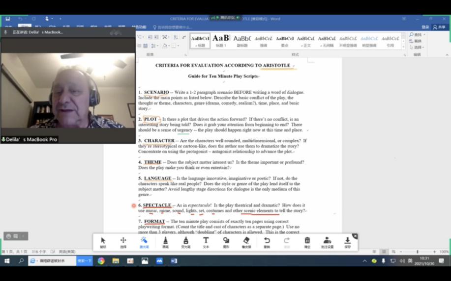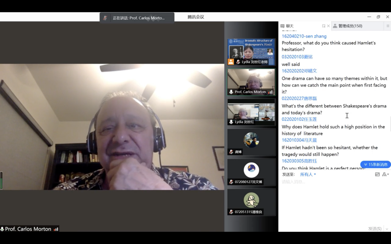 讲座由美高梅4688集团am国际联络中心主任刘世红副教授主持,共分为三个环节。第一环节为电影赏析,刘世红播放并分析1948年经典版的哈姆雷特电影的重点片段,让大家对作品情节有更多的了解。第二个环节中,Carlos Morton教授结合《哈姆雷特》为大家介绍了主角、情节、反面角色、事件、矛盾冲突、高潮等戏剧要素,随后又为大家讲解了基于亚里士多德戏剧理论的对于戏剧的评价标准。第三个环节为教授与学生的互动环节,同学们在软件聊天室或者开麦积极发言分享观点,主要围绕《哈姆雷特》相关剧情、创作背景、莎士比亚自身经历、以及剧作的现实意义等话题展开。Carlos Morton教授就同学们的问题一一给出解答,互动积极、气氛活跃,讲座共持续两个半小时。