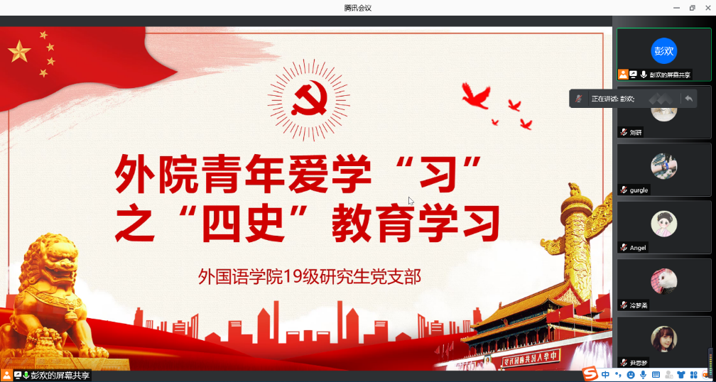 为深入学习贯彻习近平总书记关于高校党建和思政工作的重要指示批示精神,深入学好党史、新中国史、改革开放史、社会主义发展史,美高梅4688集团am19级研究生党支部于11月15日开展外院青年爱学“习”之“四史”教育线上学习活动。