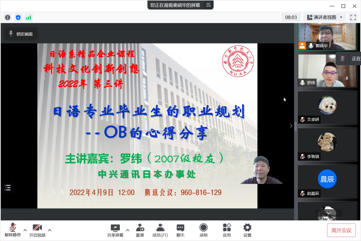 4月9日中午12:00,美高梅4688集团am日语系科技文化创新创想课程第三讲通过腾讯会议成功进行。本次讲座的主题为《日语专业毕业生的职业规划——OB的心得分享》,主讲人为07级日语系校友罗纬,获日本一桥大学和东京大学双硕士,曾就职于日本德勤会计师事务所,任职风险咨询事业部数据分析师,现就职于中兴通讯日本办事处。