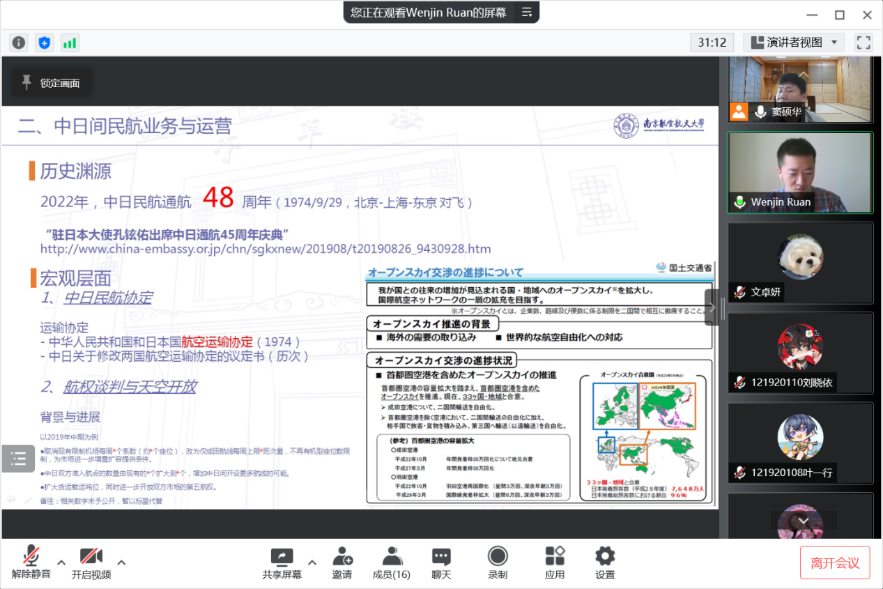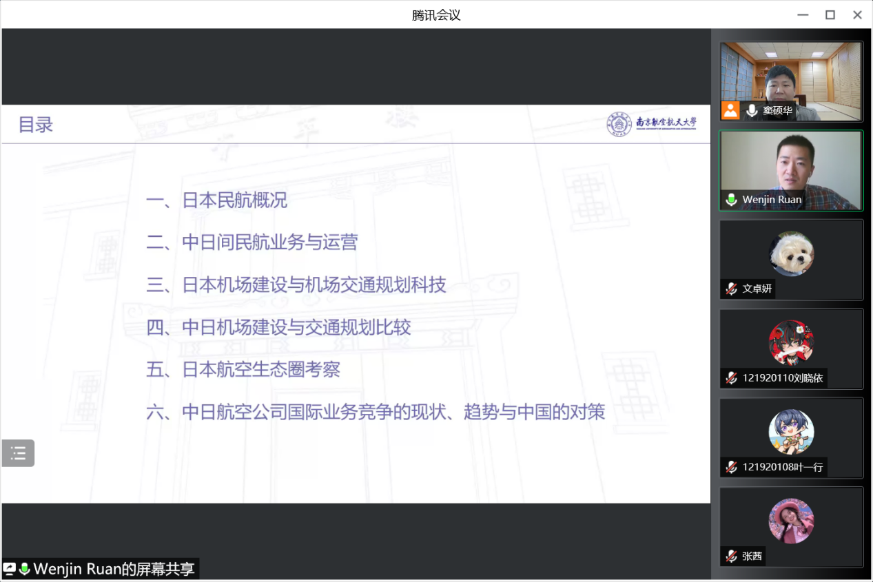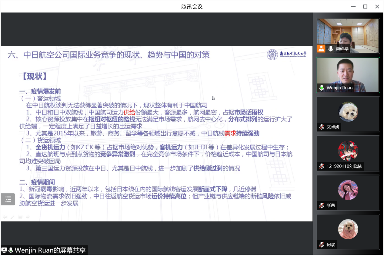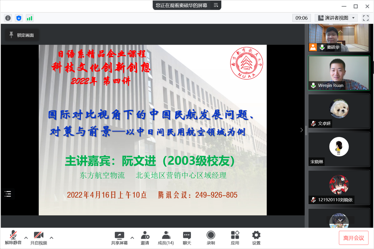 4月16日上午10点,美高梅4688集团am日语系精品企业课程《科技文化创新创想》2022年度第四讲通过腾讯会议成功进行,本次主题为《国际对比视角下的中国民航发展问题、对策与前景——以中日间民用航空领域为例》。主讲嘉宾为03级日语系校友、现就职于东方航空物流北美地区营销中心的阮文进经理。