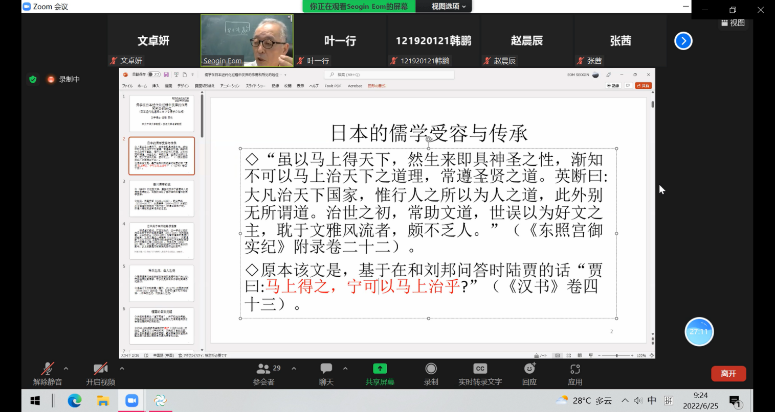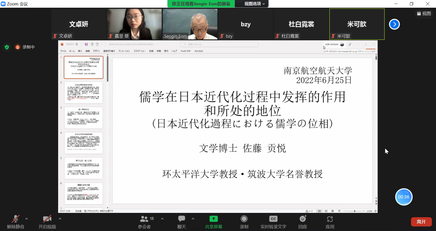 6月28日(周六)上午9:00,美高梅4688集团am日语系海外名师讲坛第二讲通过线上ZOOM会议成功进行,主题为《儒学在日本近代化过程中的作用》。主讲嘉宾为环太平洋大学教授・筑波大学名誉教授佐藤贡悦。