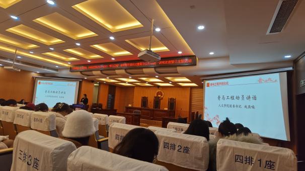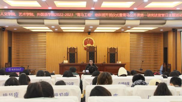 12月4日,人文与社会科学学院、艺术学院、美高梅4688集团am在人文学院模拟法庭联合举办2022-2023年“青马工程”培训班开班仪式暨青马公开课第一讲,人文与社会科学学院法律系优秀青年教师洪骥、人文学院团委书记赵燕喃、艺术学院团委书记汪明锐、美高梅4688集团am团委书记李萍以及三个学院的百余“青马工程”培训班学员共同参与活动。