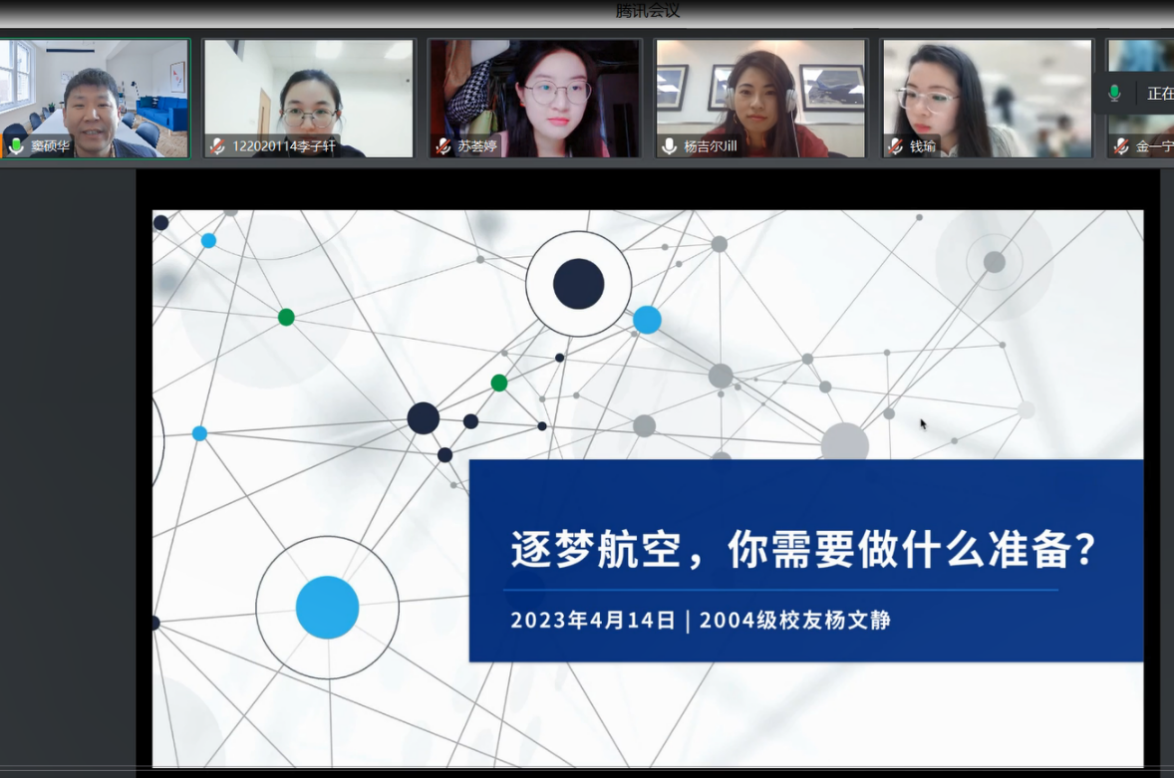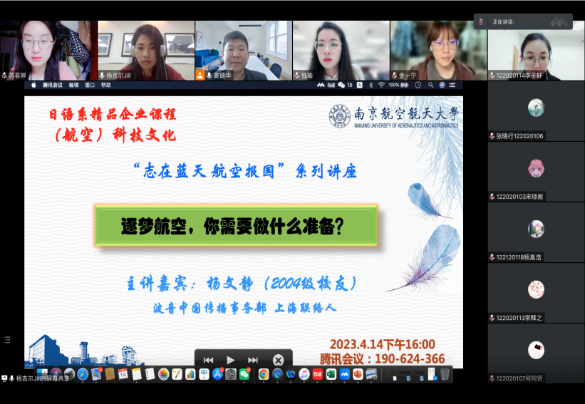 4月14日下午,日语系精品企业课程第三讲(“志在蓝天,航空报国”2023年度讲座之二)通过腾讯会议成功举办。本次讲座主题为《逐梦航天,你需要做什么准备?》,主讲人为2004级校友杨文静,来自波音中国传播事务部。日语系窦硕华老师主持了讲座, 2020级和2021级本科生参加了讲座。