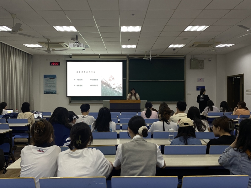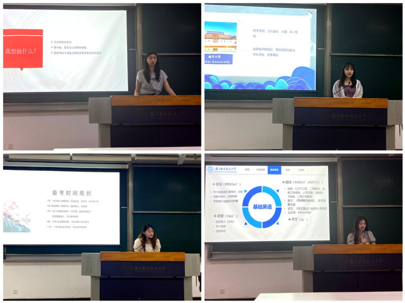 活动开始,大三年级中心组成员朱芸与田欣如同学介绍了四位同学被录取的院校情况。之后,2022年美高梅4688集团am英语笔译方向初试第二名的凌晨妍同学分享了MTI考研经验。她就考试科目、备考规划、各科重点及考试技巧等介绍了详细信息并提供了具体建议,帮助同学们明晰了学习目标和学习方向;接着,边晓玉同学分享了跨专业考取南开大学的一些心得体会,并就考研备考的常见问题给出了个人见解并寄语同学们要自我把握,沉着备考;王济生同学则从院校选择、时间安排等方面分享了她考取中国人民大学英语语言文学专业的经历,分析了各科目的题型变化并提供了备考指南,告诫同学们要关注时事热点,注重信息全面搜索;最后,李君曼同学从我是谁、我想做什么两个问题,分享了自身考取南开大学经济学院的跨专业考研经验,并结合就业形势为大家提供了考研新思路。