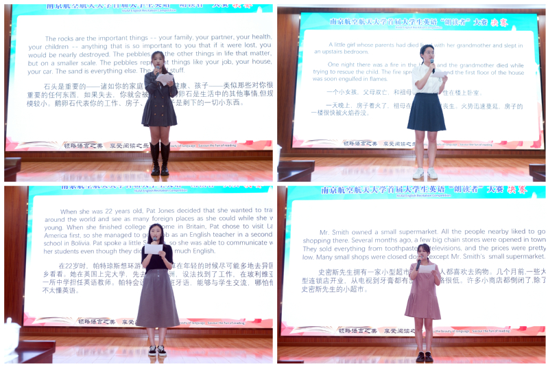 本次大赛以 “领略语言之美,享受阅读之乐”为主题,跨越三轮赛事,历时2个月,共有来自校内13个学院的316名选手参加比赛。决赛现场,来自全校6个不同专业的10强选手同台竞技,一展风采。各位选手以意气风发的姿态、标准生动的语言登台朗读,充分展现了我校学子扎实的英语朗读功底,也为台下的嘉宾评委和同学们带来了高质量的视听享受。