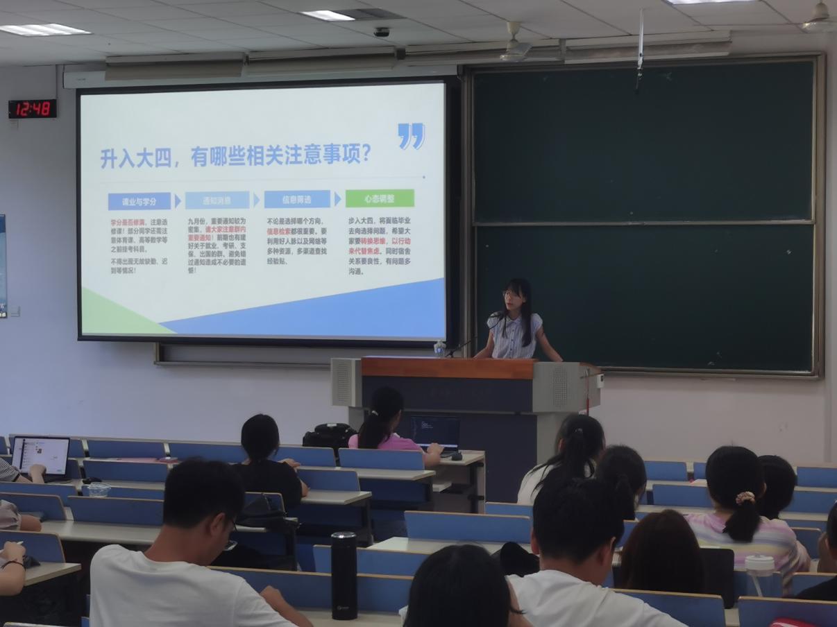 首先,辅导员赵瑜瑶大致介绍了近6年来美高梅4688集团am本科生的升学率与就业情况,引导同学们要理性分析考研与就业形势,合理定位。之后,强调升入大四后,同学们要注意学分是否修够,多关注年级群内重要消息通知,并注意心态调整等。