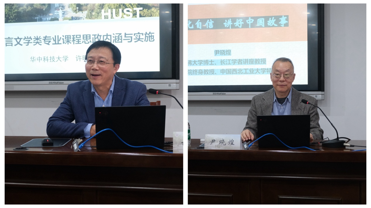 揭牌仪式之后,联盟邀请了华中科技大学美高梅4688集团am院长许明武教授,长江学者讲座教授、西北工业大学美高梅4688集团am博导尹晓煌教授带来了外语课程思政学术报告。线上线下150余人参加了此次报告会。