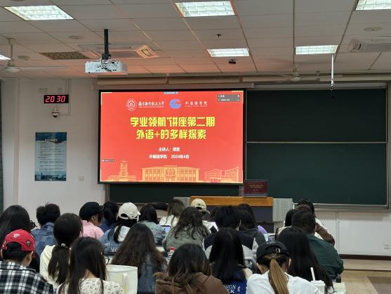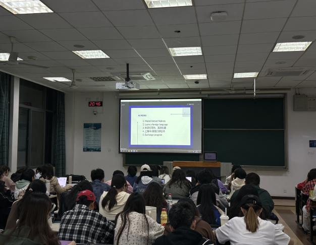 谭笑首先分享了自身的学习工作的经历。自2015年至2018年在南航取得硕士学位后,在2018年至2023年远赴美国亚利桑那州立大学读博,现于杜克大学担任讲师一职。在南航学习期间,谭笑参与了模拟联合国、外研社写作比赛和联合国实习项目,并自学第二外语、考取了上海中高级口译证书。谭笑强调参加该类活动对英语学习的重要帮助,结合自身经历表示模拟联合国活动对英语写作有重大提升作用,参加写作比赛通过集训等方式可以提高读说写的素养与能力。其次,谭笑分享了更多国际化的学习资源,鼓励同学们积极参加如外语写作教学与研究国际研讨会等学术会议。