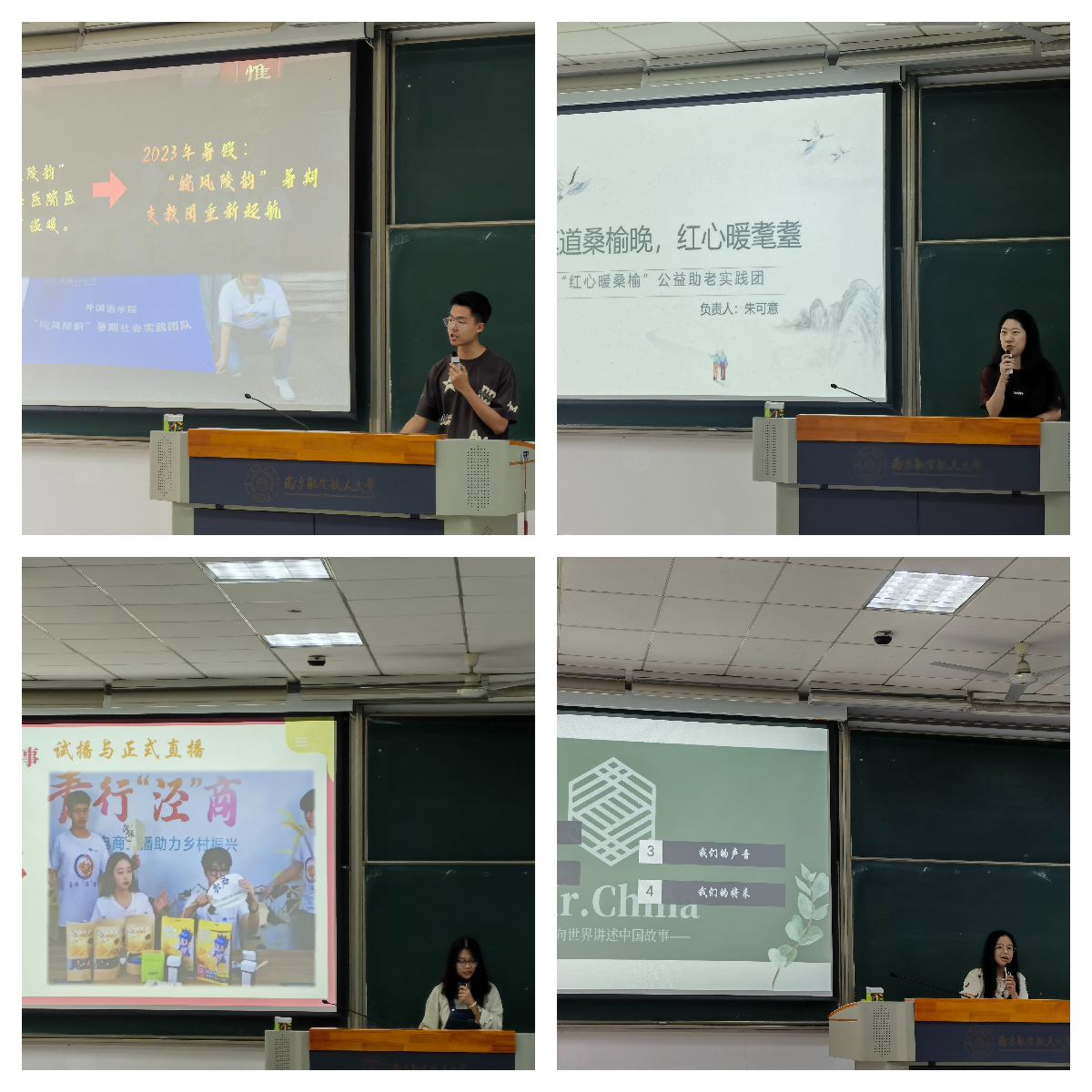 之后,学院Mr.China-向世界讲述中国故事团队、青行泾商电商直播团队、皖风陵韵爱心支教团队、红心暖桑榆公益助老团队依次对团队概况、往年实践开展情况、今年实践计划进行了介绍,并现场进行了队员招募。