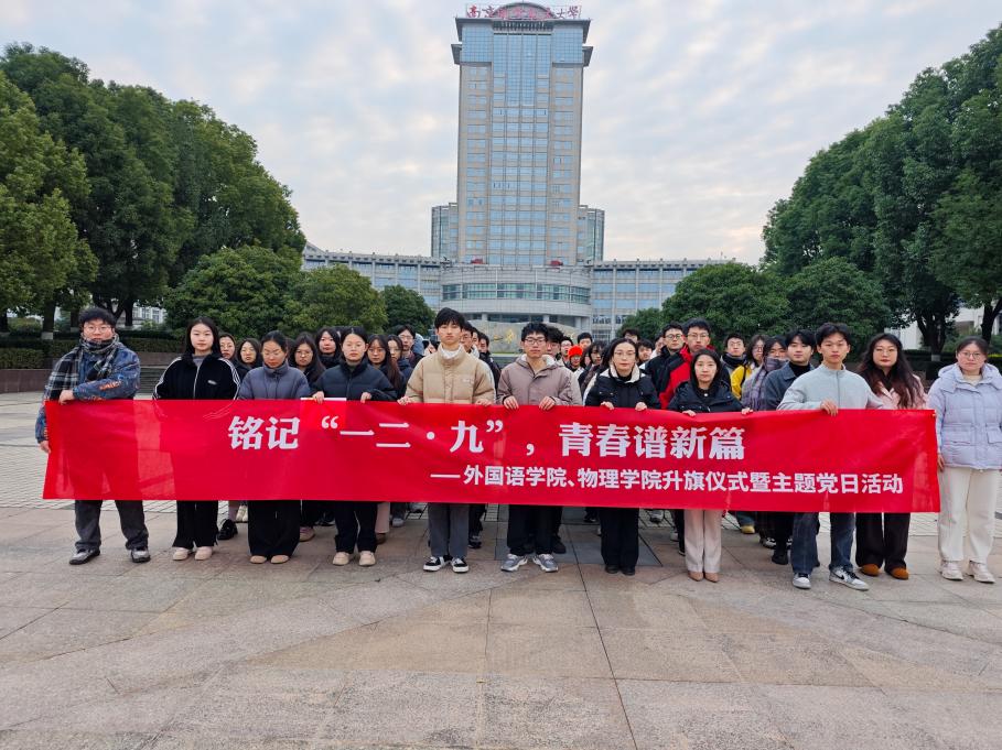 铭记历史,不忘初心。今天是“一二·九”抗日救亡运动89周年纪念日,美高梅4688集团am联合物理学院共同举办“铭记‘一二·九’,青春谱新篇”升旗仪式暨主题党日活动。美高梅4688集团am党委副书记吴科颖,物理学院党委副书记欧珊,两学院辅导员代表朱芸、于金巧,美高梅4688集团am本科生联合党支部党员代表、积极分子、发展对象代表,物理学院全体本科生党员、2023级全体本科生参加活动。