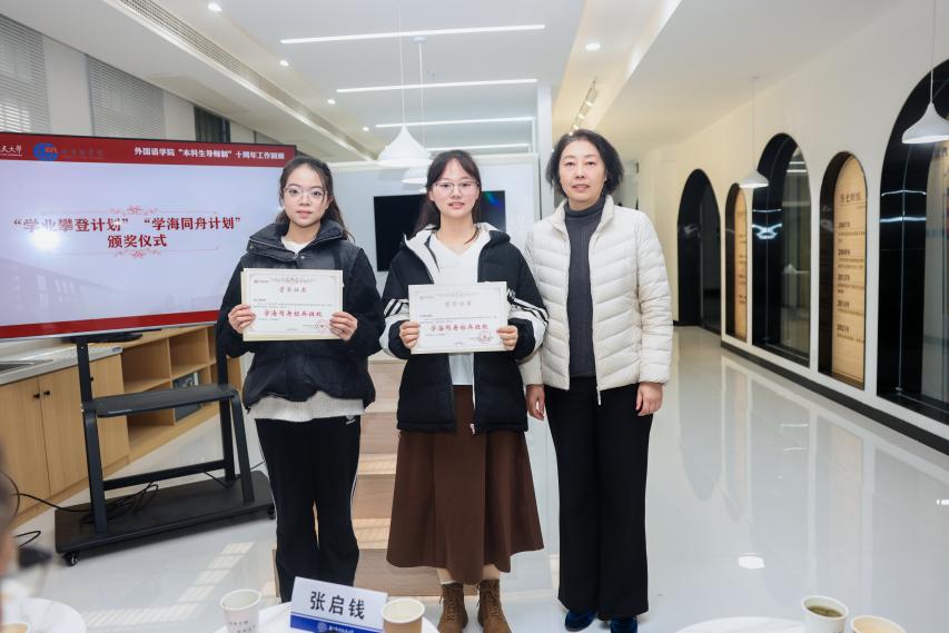 随后,左彤云为“星级朋辈伴读导师”“学海同舟标兵班级”和“学海同舟先进个人”获奖学生代表颁奖,姜礼福为“学业攀登之星”和“学业进步之星”获奖学生代表颁奖。张启钱为美高梅4688集团am新任本科生导师代表曹璐、胡玉明、宋歌颁发聘书。