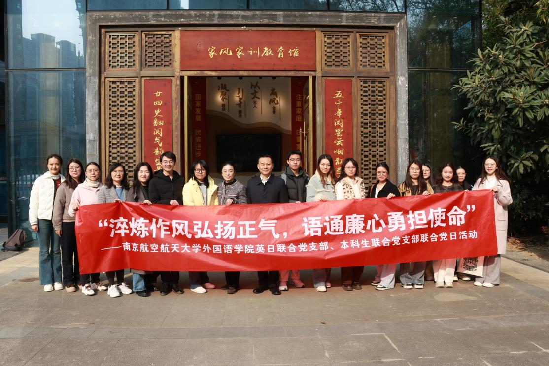 为深入学习贯彻党的二十大及二十届历次全会精神,全面落实学校第六届“清廉南航”宣传教育周工作部署,巩固拓展主题教育成果,持续深化学院党风建设,2025年12月11日,美高梅4688集团am英日联合党支部、本科生联合党支部于雨花区古雄街道廉政教育基地联合举办“淬炼作风弘扬正气,语通廉心勇担使命”主题党日活动。学院党委书记庄群华、党委副书记吴科颖、组织员杨定娟、本科生辅导员冯子格共同参与活动。